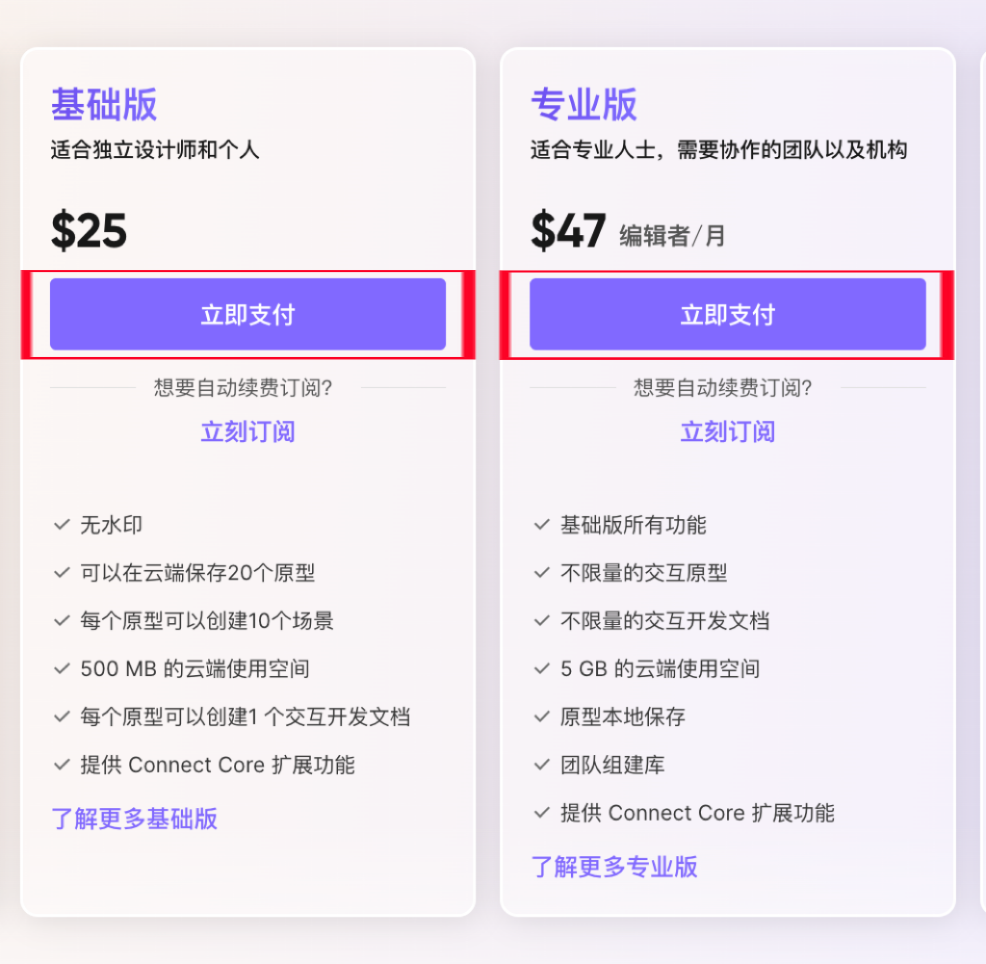 1. 选择服务:进入我们的官网的套餐介绍页面,选择您需要的基础版或专业版套餐,点击 ”立即支付“ 按钮。