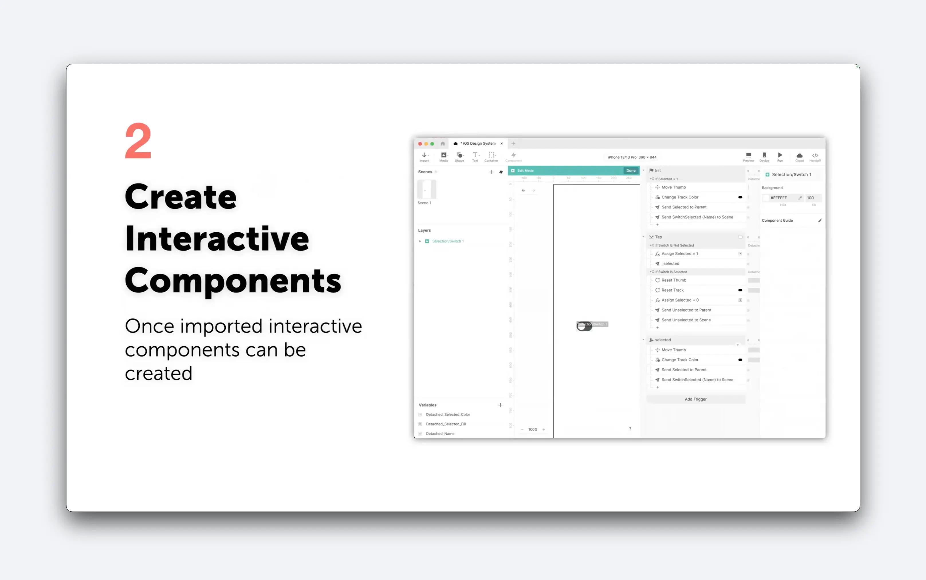在将组件导入到 ProtoPie 之后,接下来的步骤是将它们转换为 ProtoPie 组件。每个 ProtoPie 组件都有自己的变量、图层和交互,使其自成一体,便于管理。