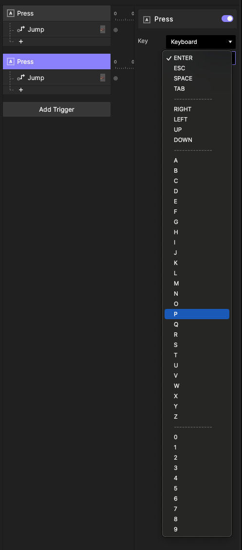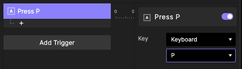添加一个按键按下的触发动作,并将其配置为对 “P” 键的按下作出反应。为了更直观地对触发反应动作进行管理,可以将这个触发反应动作重命名为所关联到的按键名称。