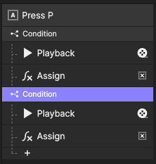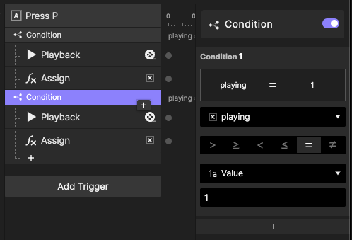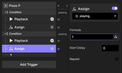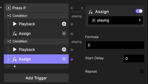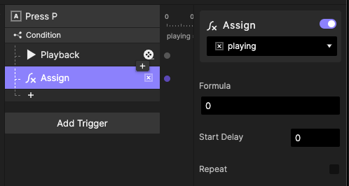 这个场景中目前已经有了一个触发动作来对回车键作出反应,现在我们希望播放/暂停按钮也可以执行同样的反应动作,因此直接复制这个触发反应动作即可。点击选择该触发反应动作并按下 Command-D 键就能完成复制操作(在 Windows 中是按下 CTRL-D 键)。