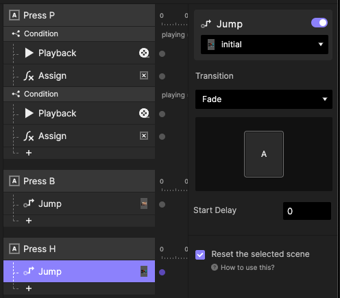 如果持续地在场景间进行跳转,你可能会留意到 “result” 场景会一直保持你离开该场景时所处的状态。如同我们对 “Press H” 这个返回主界面的触发动作所设置的一样, 通过修改 “initial” 场景内的跳转触发动作就可以实现对 “result” 场景的重置。同理的,你可能还会希望修改同样的跳转反应动作以便重置从 “landing” 场景到 “playing” 场景的跳转。