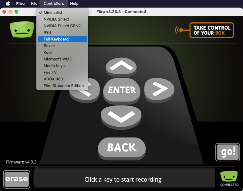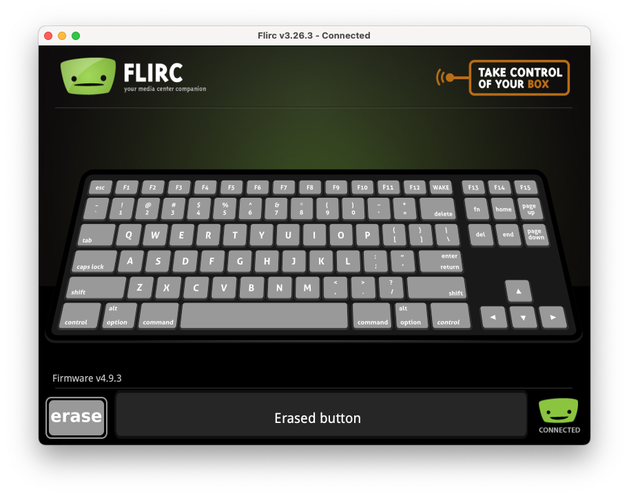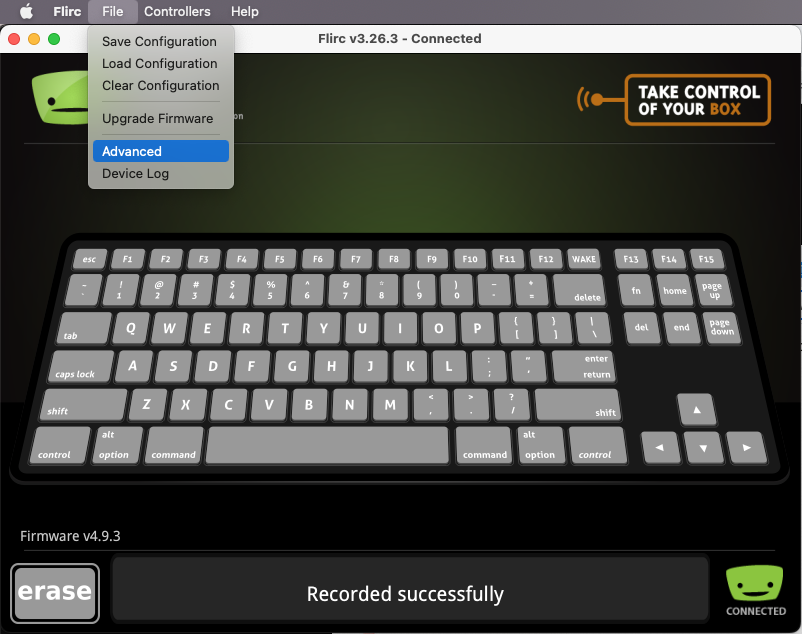 如果做错了一些步骤,撤销操作也十分简单。在 FLIRC 软件中点击 “Erase”,然后将遥控器对准 FLIRC 接收器并按下你希望清除设置的遥控器按钮,即可完成相应的清除操作。同时,还可以通过选择 FLIRC 软件上的 File → Clear Configuration 来清除 FLIRC 的所有设置以便完全重新进行设置。