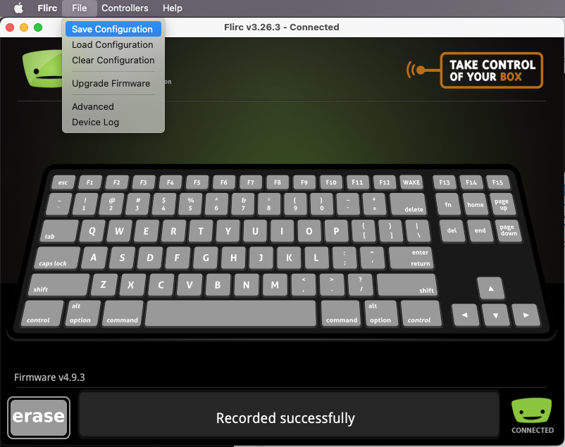 3. 重新创建到 “B” 键的映射,但这次在 FLIRC 记录遥控器按钮时务必保持遥控器按钮按着不放,直到在FLIRC软件界面上看到 “Recorded Successfully” 的提示。