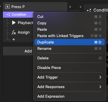 到此已经将Pie配置为如果视频正在播放,则执行暂停。现在还需要添加第二个条件,即如果视频已经暂停,则执行继续播放。这个条件和反应动作与刚刚创建好的第一个极为相似,所以只需要复制第一个条件并稍作修改即可。点击选择刚刚创建好的第一个条件,然后右键单击并选择 “创建副本”(也可以使用键盘上的CMD-D / CTRL-D来完成这一操作)。