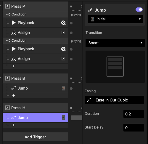 仍然是在 “playing” 场景中进行操作,添加另一个按键按下触发动作,这次是关联到键盘的 “H” 键上。