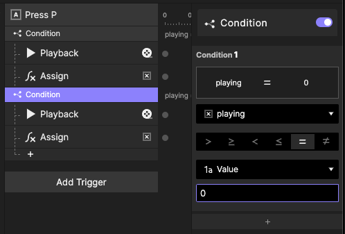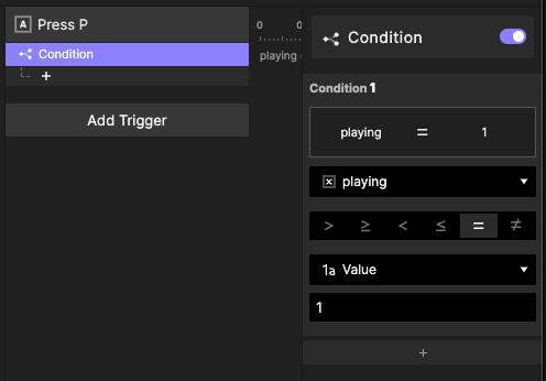 现在回到这个按键按下触发动作上,添加一个条件(Condition)并按下图进行设置: