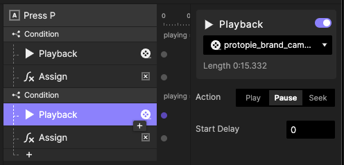 考虑到这是一个类似开关切换性质的操作,在触发这个反应动作时,需要做一下判断。如果视频是正在播放的,那么我们希望触发时执行暂停,而如果原本是暂停的,我们希望触发继续播放。ProtoPie没有提供视频图层是否正在播放的属性,因此我们只能使用别的方式对播放状态进行追踪。
