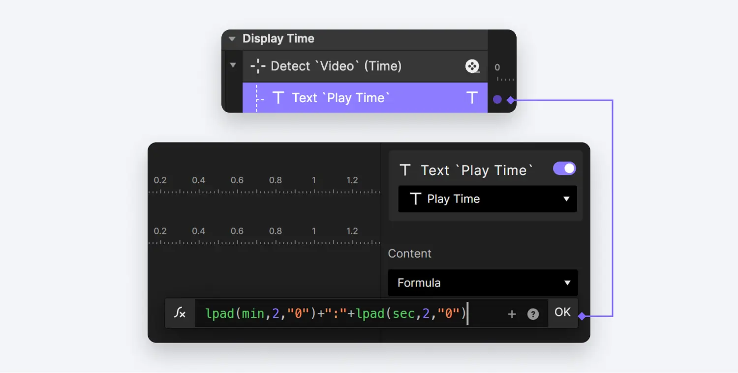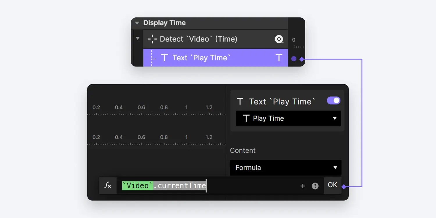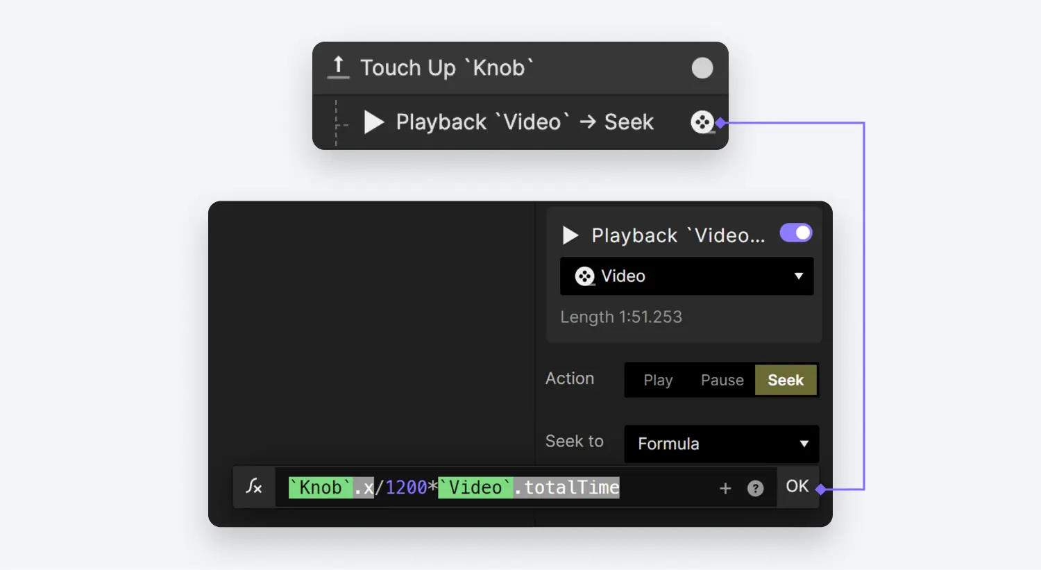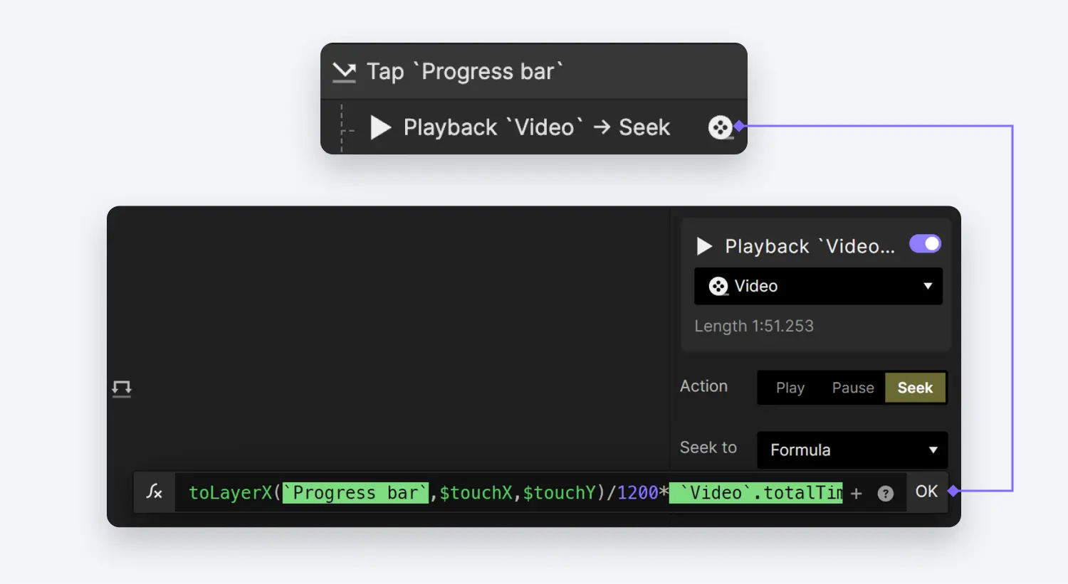 - 对于 Touch Up 操作,我们将为 Video 图层设置一个 Playback 反应。在 Playback 反应中,我们将选择 Seek 选项,并为此目的使用一个公式:
