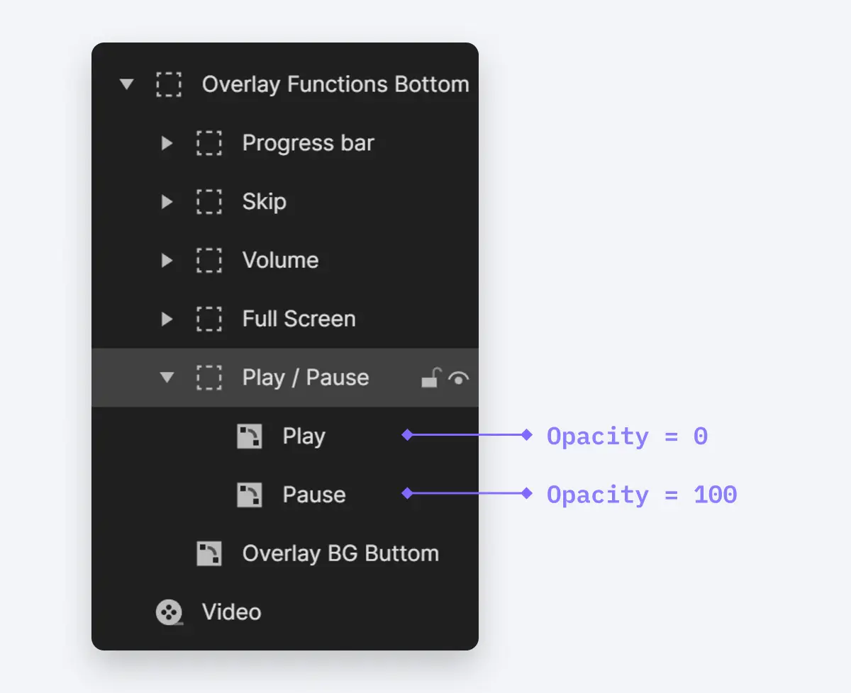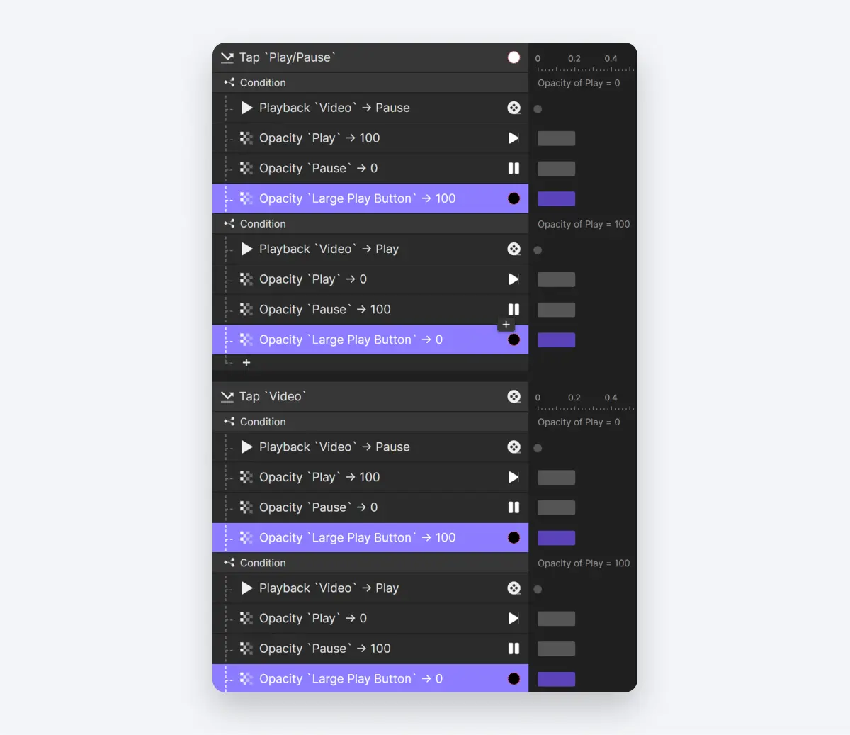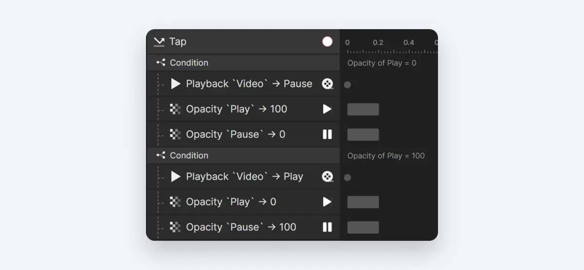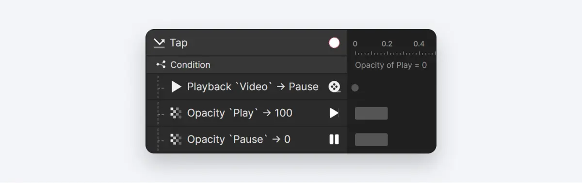 首先,在“Play/Pause”组上添加一个单击触发动作。接下来,我们将创建一个基于播放图标的透明度等于0的条件。在这个条件下,我们将为视频图层添加一个播放反应来暂停它。 与此同时,我们还需要切换图标。对于播放图标,将其透明度设置为100,对于暂停图标,将其不透明度设置为0。
