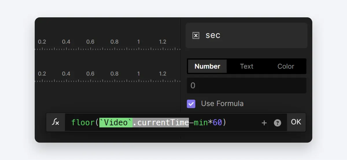 - 对于 sec 变量,我们将使用 floor(`Video`.currentTime-min*60)这个表达式。该公式通过从视频当前播放时间中减去分钟(在 min 变量中先前计算)乘以 60,然后向下取整来计算秒钟部分。