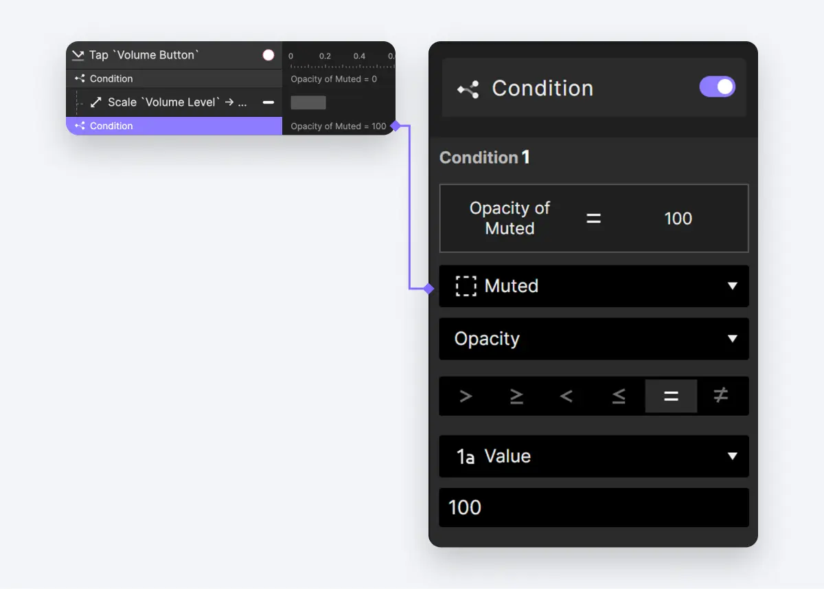 - 让我们为“已静音”组的不透明度为0时建立一个条件,表示视频现在有声音。当满足这个条件时,我们将配置“音量级别”图层的宽度为0。