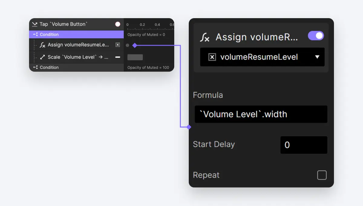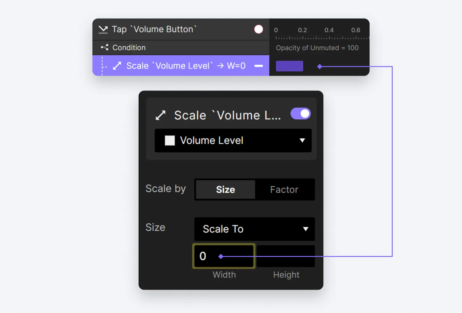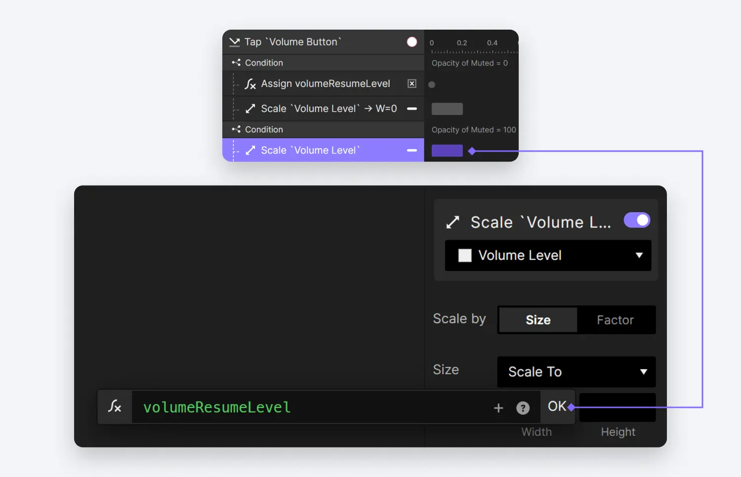 Opacity of Muted = 100),我们现在可以在 Volume Level 图层上实施一个 Scale 动作。此动作将使该图层缩放到存储在volumeResumeLevel中的值,有效地将音量恢复到静音之前的原始级别。