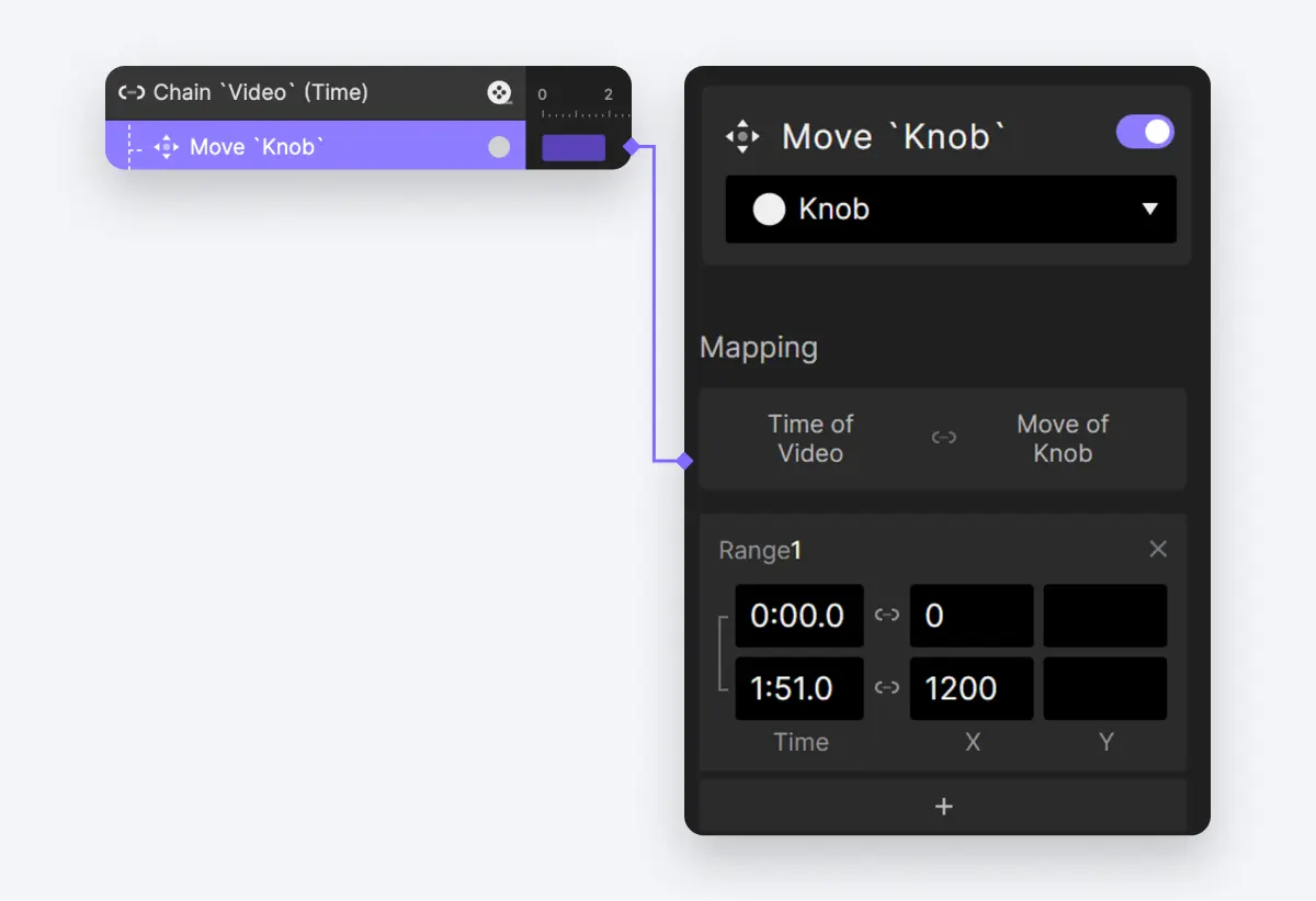 对于视频的范围,它将从开始时间延伸到结束时间。关于Knob的X位置,它应该从最左边移动到最右边,因此在这种情况下,它将从0px到1200px的范围。这个设置将使进度条与视频的播放时间同步。