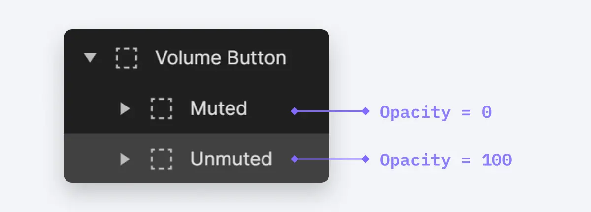 - 与我们处理播放/暂停按钮的方式类似,在“音量按钮组”内,你会看到“已静音”和“未静音”两个组。它们包含代表不同状态的图标。