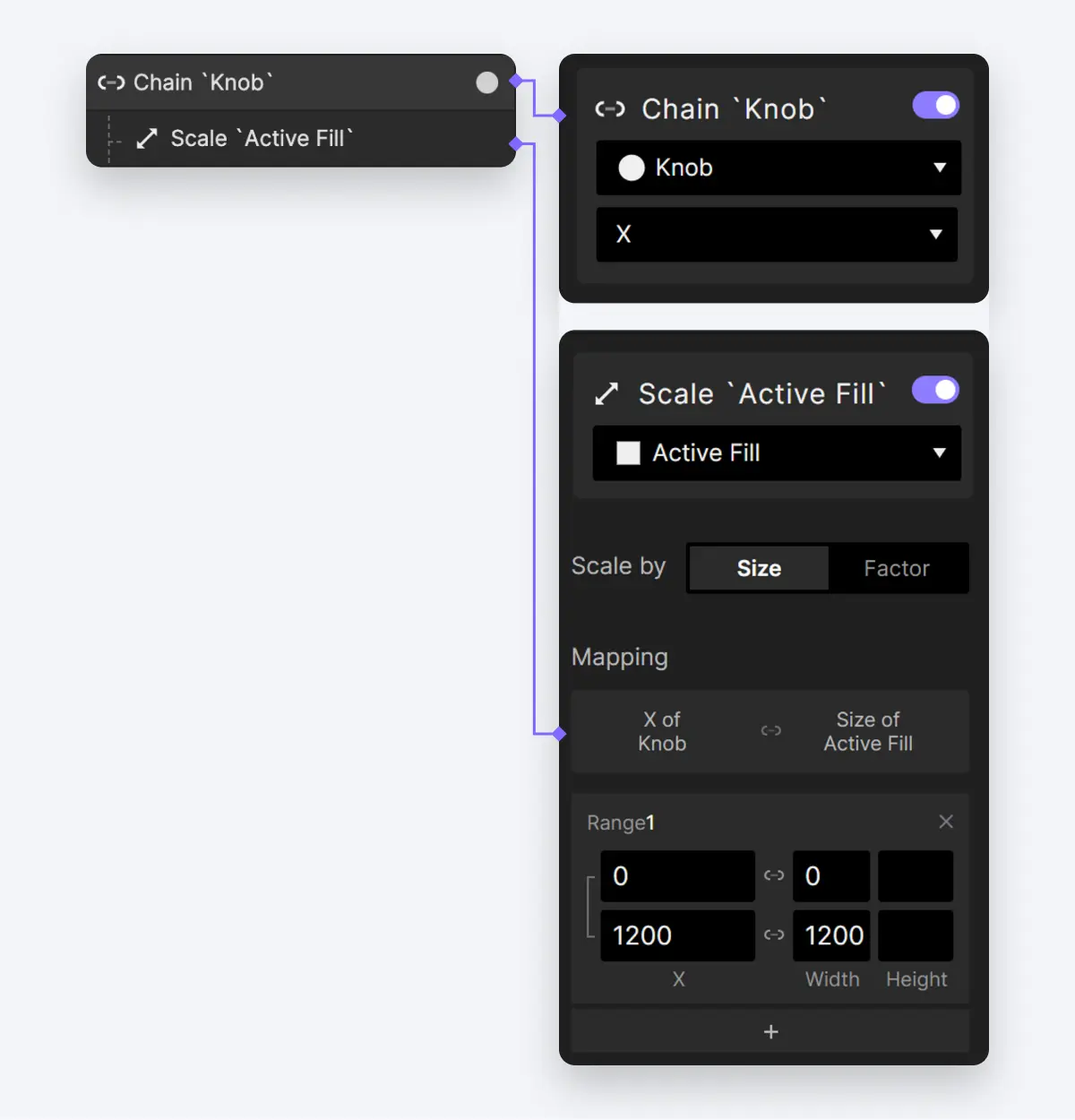 - 我们还希望Active Fill图层随着Knob的移动而缩放。在这种情况下,让我们再为Knob的X位置添加一个联动触发,然后让Active Fill进行一个大小反应。