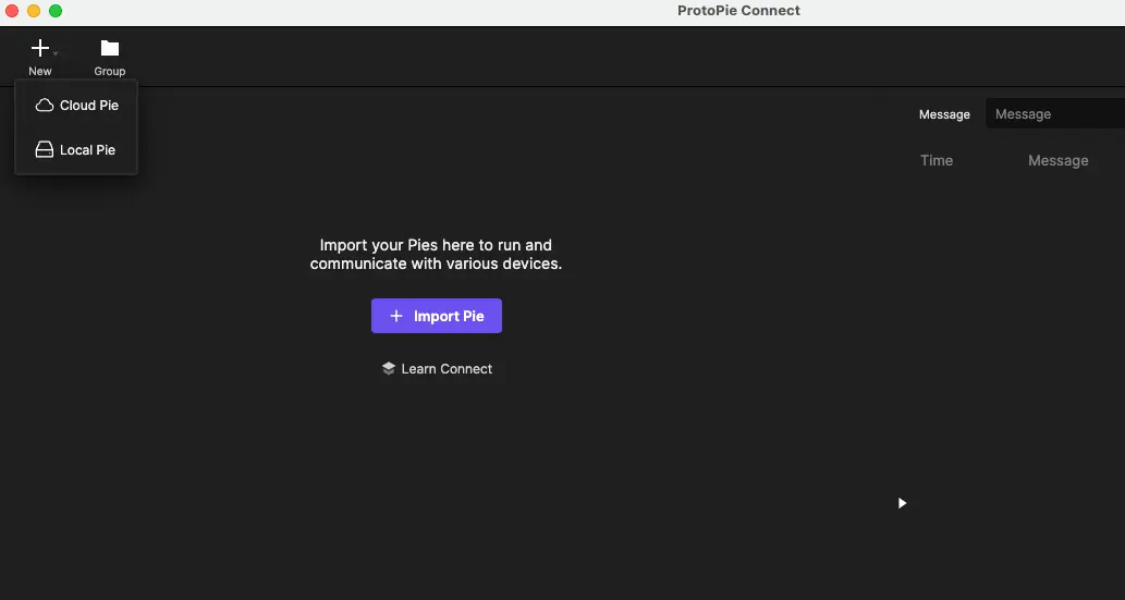 3. 启动 ProtoPie Connect 并导入你的原型,选择从云端(仅企业版)或上传本地的 Pie 文件。检查你的网络设置和权限,以避免从云端加载原型时出现连接问题。