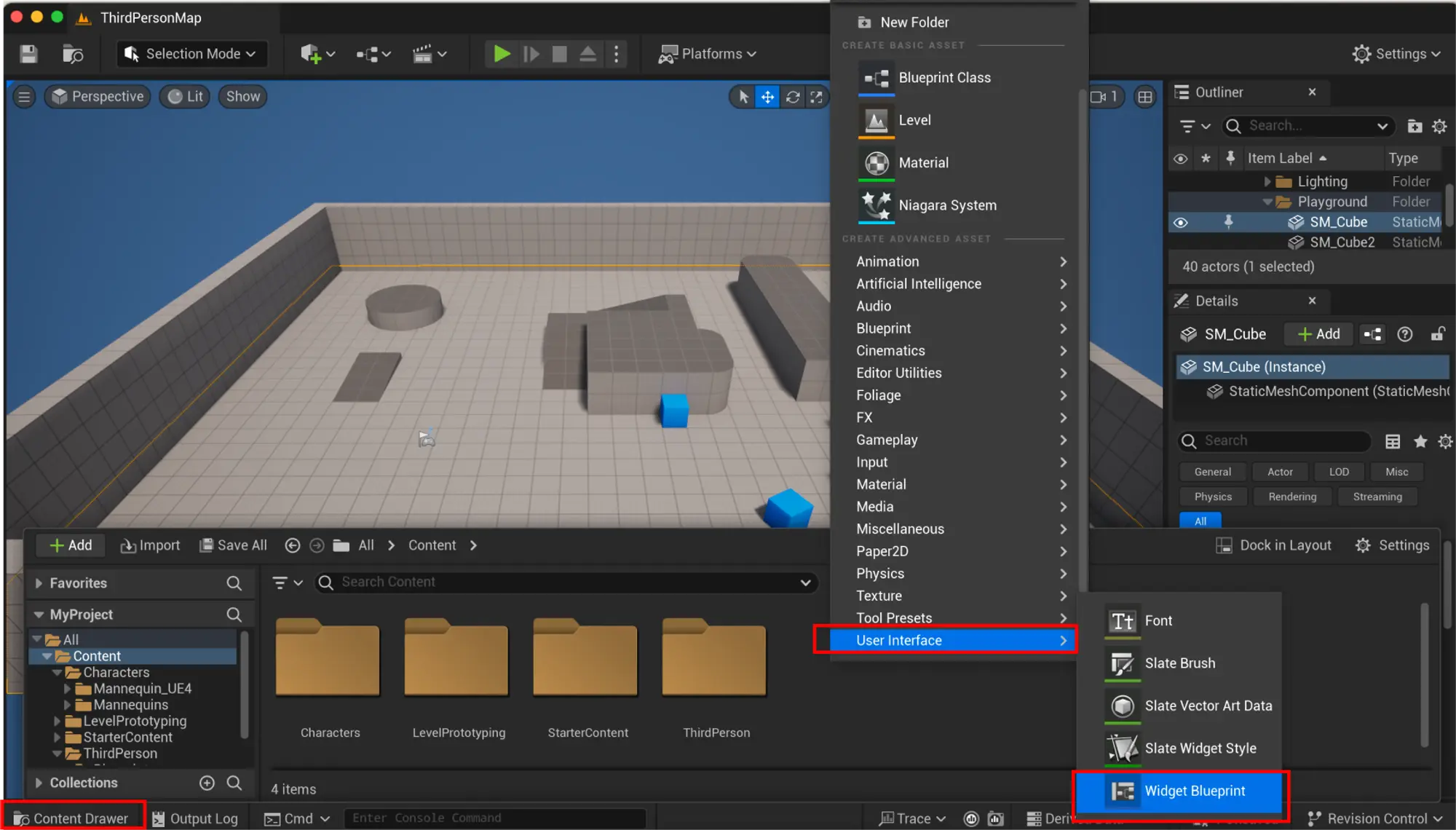 2. 在内容区域右键点击,选择“用户界面”,然后选择“小部件蓝图”以创建一个新的小部件。
