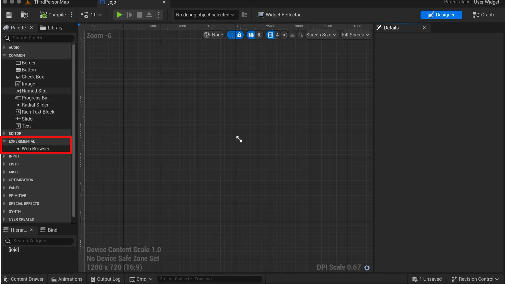 将小部件蓝图拖到主选项卡。