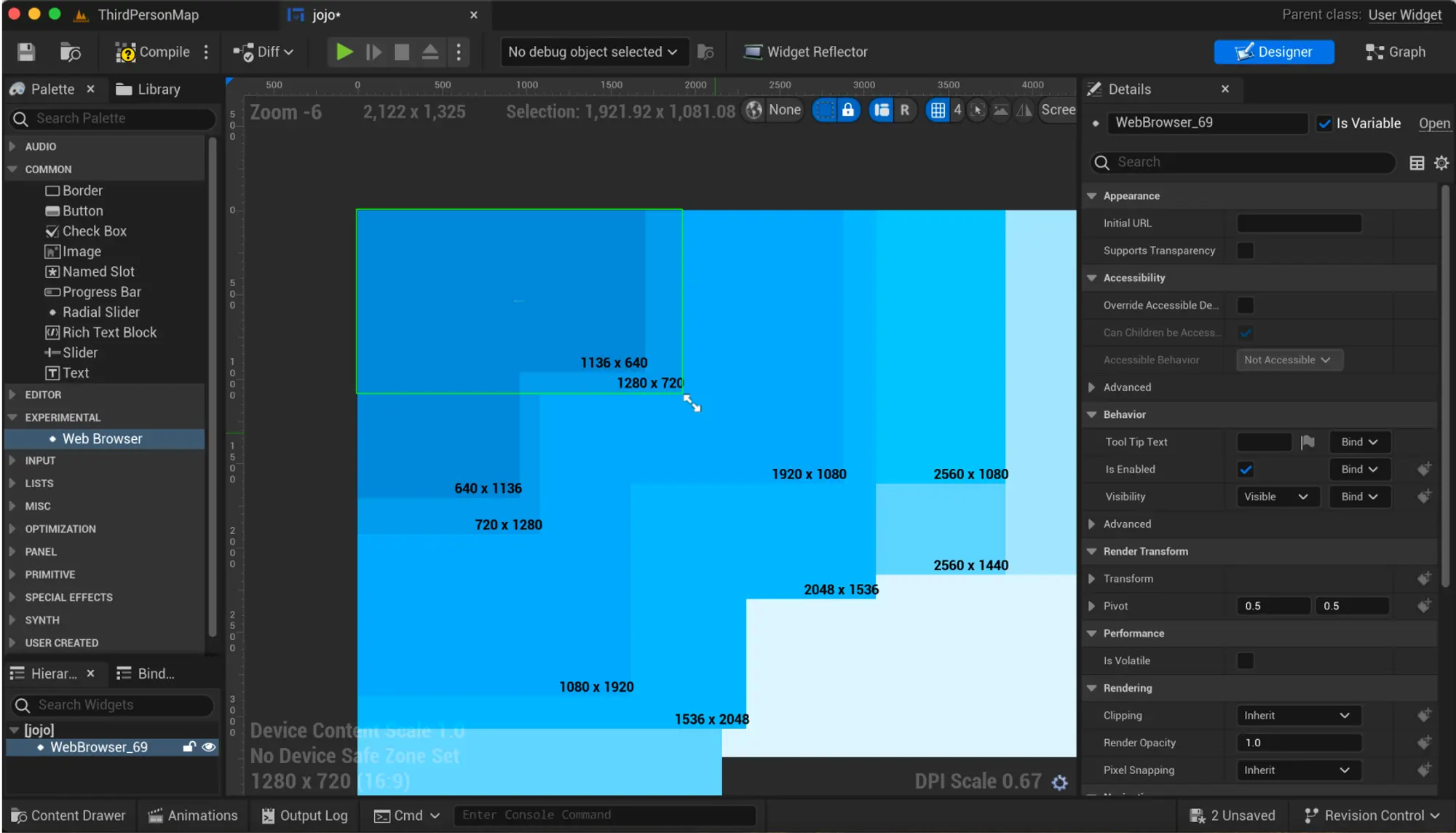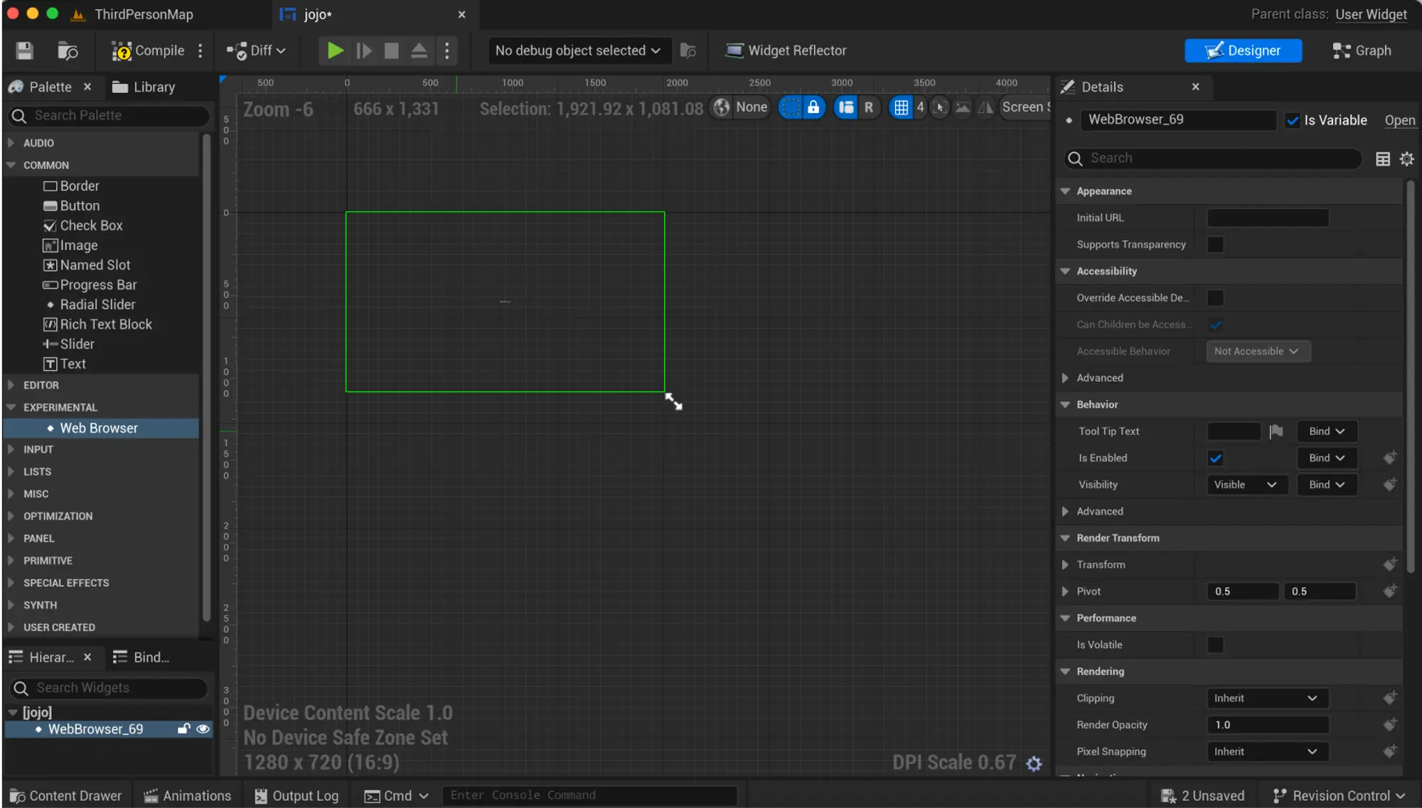 3. 在设计师标签页中,在左侧的“实验性”下的调色板面板中搜索“Web Browser”小部件。