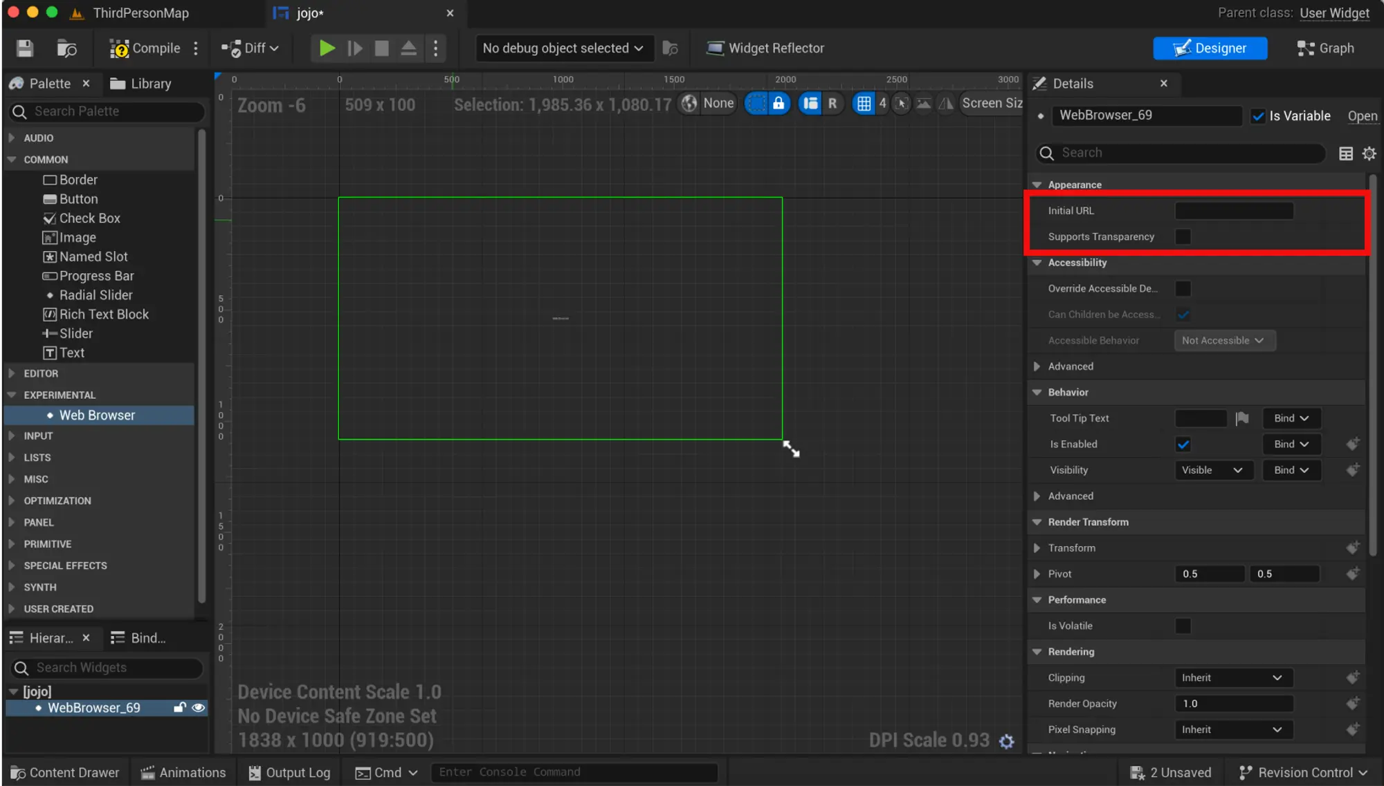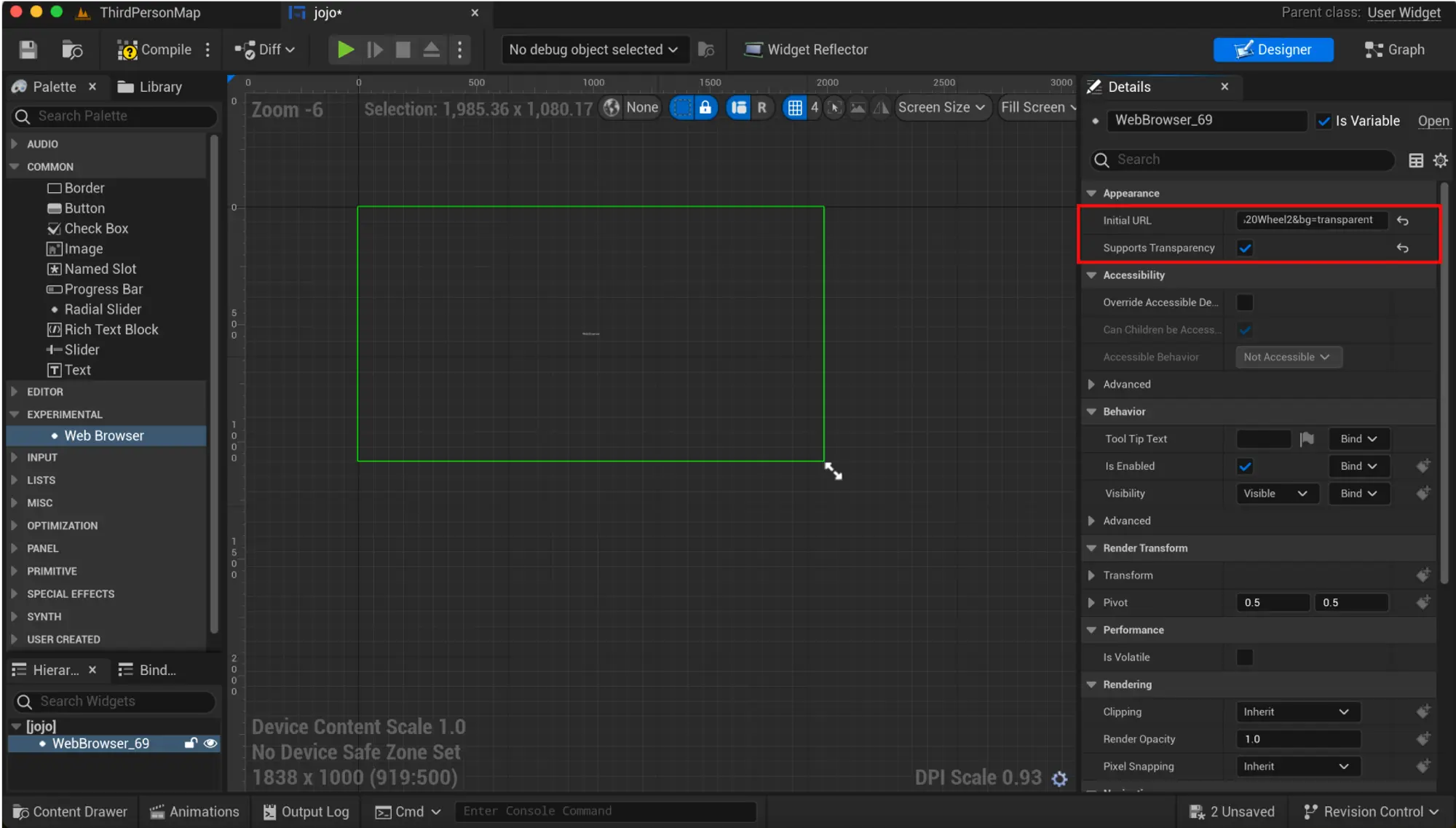 6. 从地址栏复制整个 URL,返回到 Unreal,然后将其粘贴到“Initial URL”字段中。确保启用“支持透明度”选项。